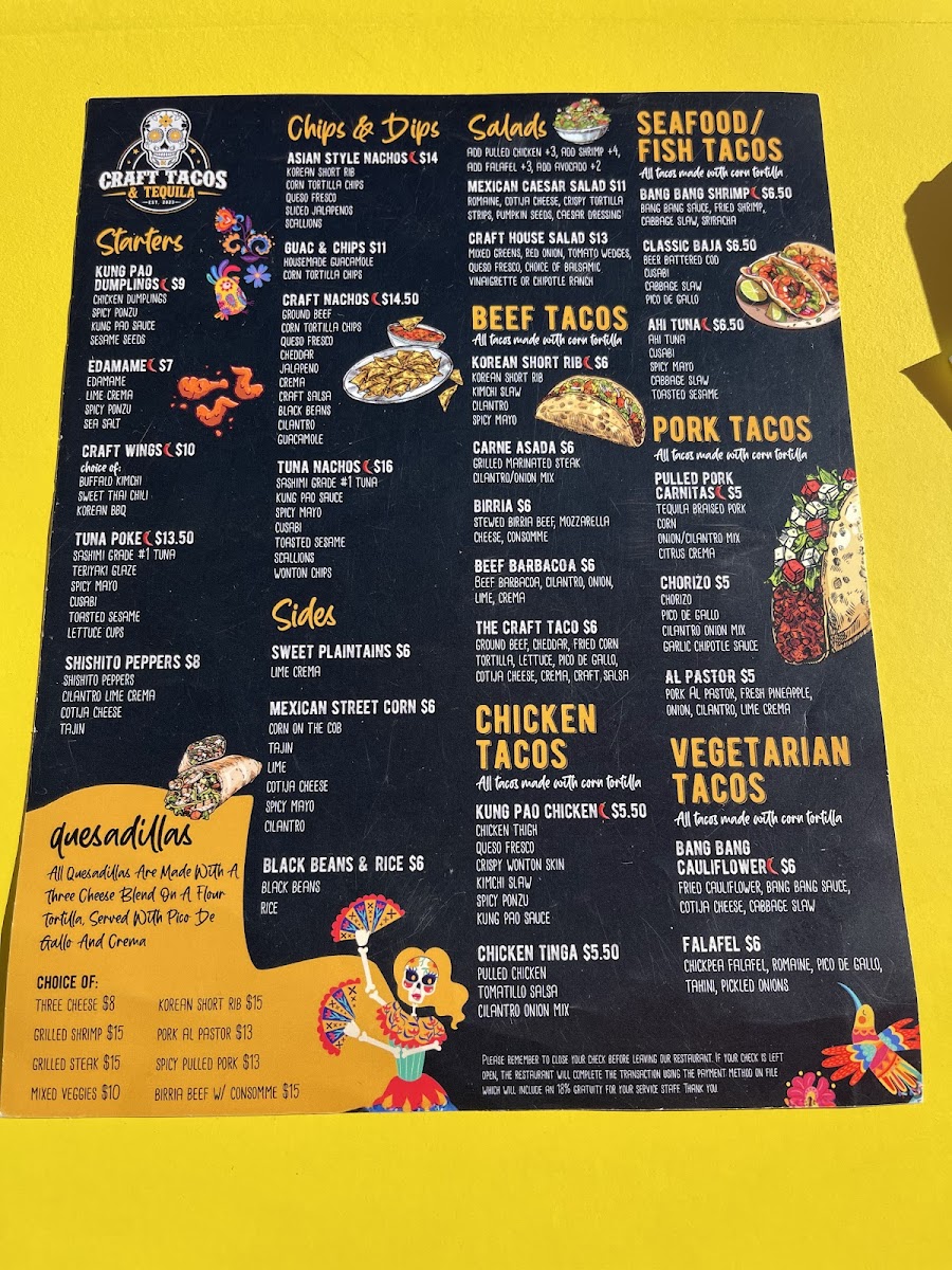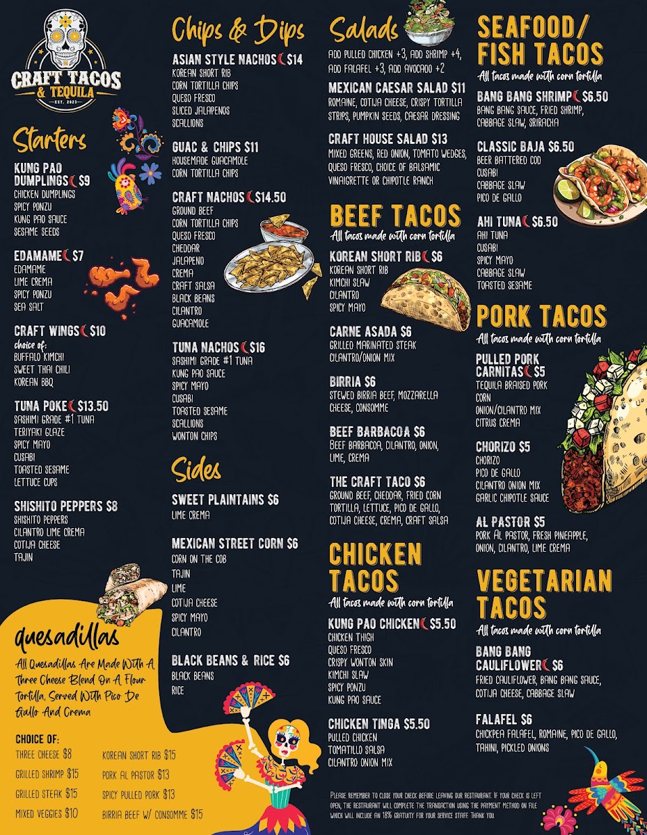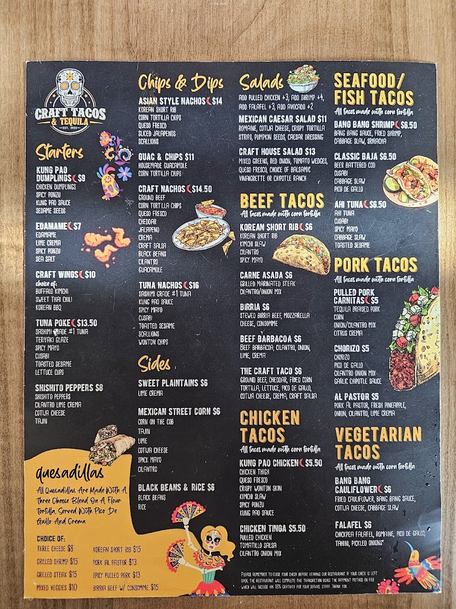 Welcome to Craft Tacos & Tequila, your go-to spot for a vibrant culinary experience in Mohegan Lake, NY. Nestled at 3137 E Main St, this restaurant beautifully blends traditional flavors with an Asian twist. Visitors rave about the extensive taco choices, including mouthwatering options like Carne Asada and Bang Bang Shrimp. But don’t overlook the surprisingly standout wings, featuring unique flavors such as Buffalo Kimchi and Korean BBQ. Each bite is a celebration of bold tastes.